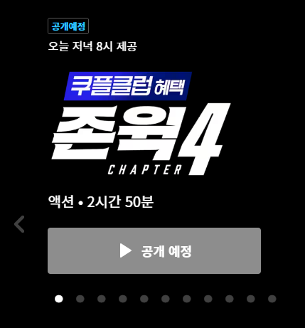 쿠팡플레어서 존윅4를 공개한다는 소식에 쿠팡플레이를 들어가보니 오늘 날짜 기준 2023년 6월 9일 오후 8시에 공개를 한다고 합니다.